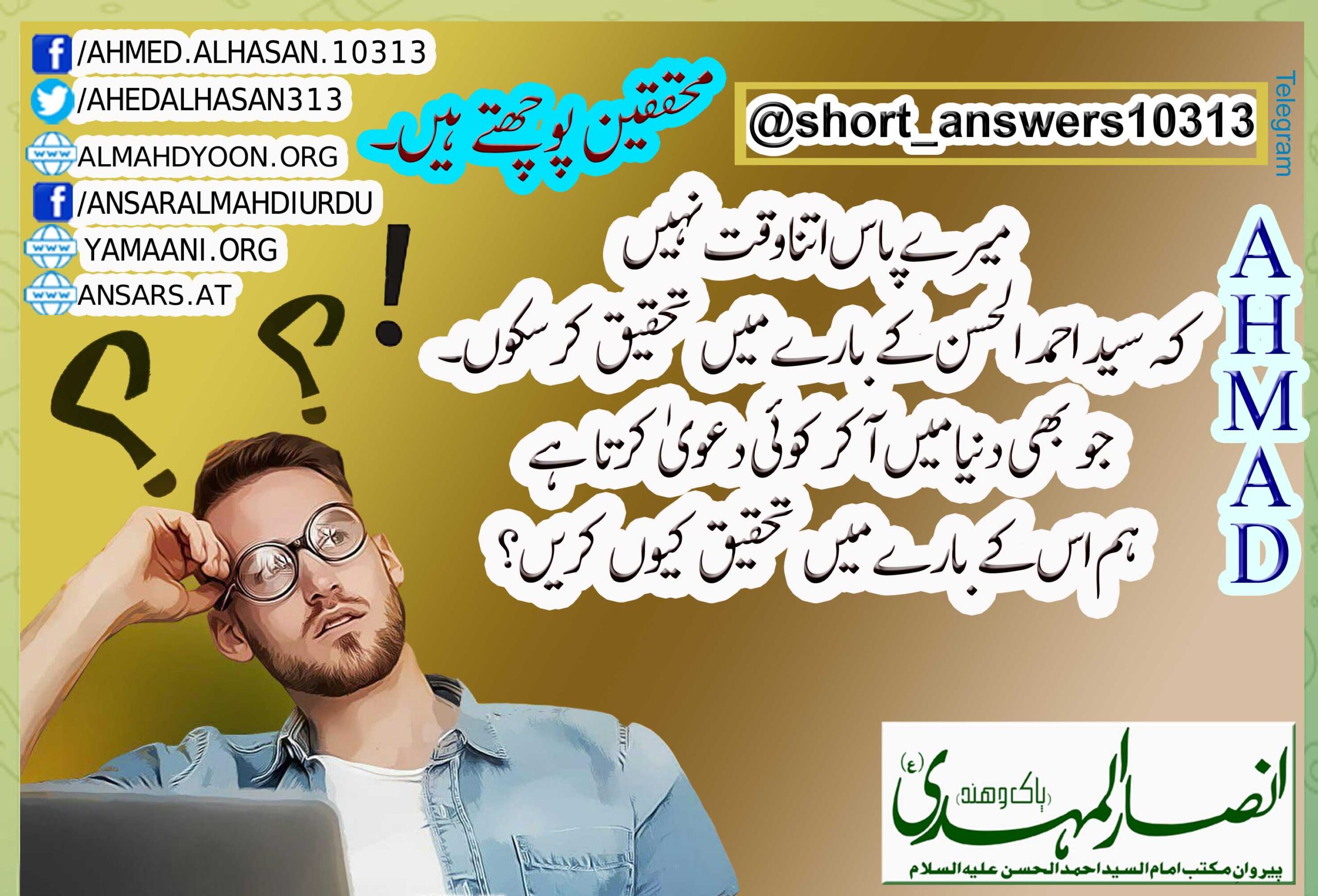 2- میرے پاس اتنا وقت نہیں کہ سید احمد الحسن کے بارے میں تحقیق کر سکوں۔ جو بھی دنیا میں آکر کوئی دعویٰ کرتا ہے ہم اس کے بارے میں تحقیق کیوں کریں؟
